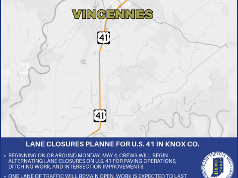 KNOX COUNTY – The Indiana Department of Transportation announces alternating lane closures for U.S. 41 in Knox County. Beginning on or around Monday, May 4,…