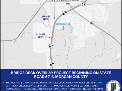 MORGAN COUNTY – Indiana Department of Transportation contractor Superior Construction Inc. is beginning a bridge deck overlay project on State Road 67 over White Lick…