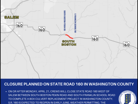 WASHINGTON CO. – Indiana Department of Transportation contractor E&B Paving, Inc. is scheduled to close State Road 160 approximately 6.6 miles east of Salem on…