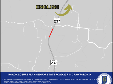 CRAWFORD CO. – The Indiana Department of Transportation announces a road closure for State Road 237 in Crawford County. Beginning on or around Monday, November…