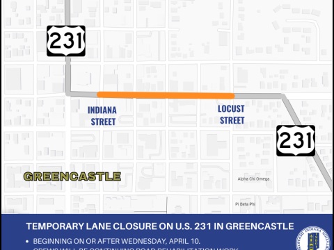 GREENCASTLE – The Indiana Department of Transportation announces temporary lane closures coming to US 231 in Greencastle. Beginning on or after Wednesday, April 10, crews…