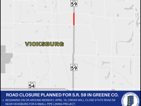 GREENE CO. – The Indiana Department of Transportation announces a road closure for State Road 59 in Greene County. Beginning on or around Monday, April…