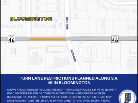 MONROE CO. — Indiana Department of Transportation contractor Milestone Contractors LP is scheduled to conduct a right turn lane closure from eastbound State Road 46 to…