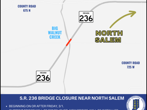 HENDRICKS CO. – The Indiana Department of Transportation announces a bridge closure on State Road 236 over Big Walnut Creek near North Salem. Beginning on…