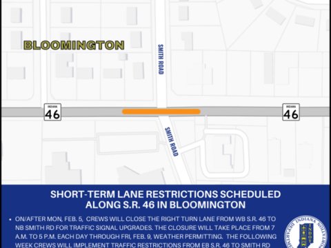 BLOOMINGTON – Indiana Department of Transportation contractor Milestone Contractors LP is scheduled to conduct short-term lane restrictions at the intersection of State Road46 and Smith…
